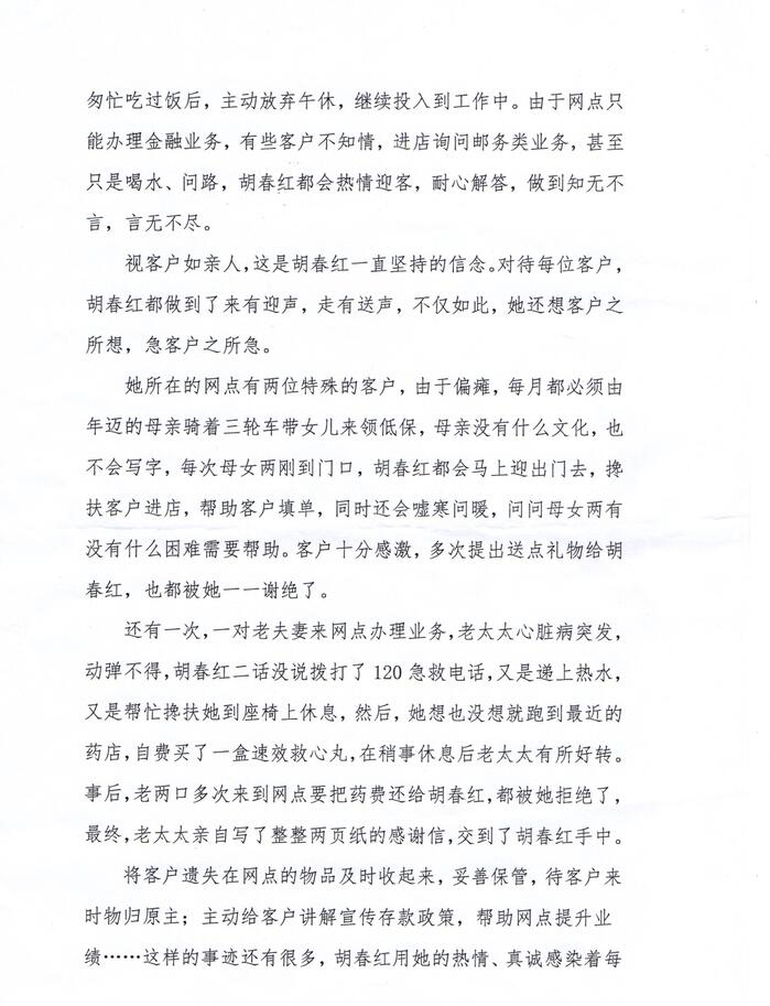 還有一次,一對(duì)老夫妻來網(wǎng)點(diǎn)辦理業(yè)務(wù),老大大心臟病突發(fā),動(dòng)彈不得,胡春紅二話沒說撥打了120急救電話,又是遞上熱水又是幫忙攙扶她到座椅上休息,然后,她想也沒想就跑到最近的藥店,自費(fèi)買了一盒速效救心丸,在稍事休息后老太大有所好轉(zhuǎn)事后,老兩口多次來到網(wǎng)點(diǎn)要把藥費(fèi)還給胡春紅,都被她拒絕了,最終,老大大親自寫了整整兩頁紙的感謝信,交到了胡春紅手中。將客戶遺失在網(wǎng)點(diǎn)的物品及時(shí)收起來,妥善保管,待客戶來時(shí)物歸原主;主動(dòng)給客戶講解宣傳存款政策,幫助網(wǎng)點(diǎn)提升業(yè)績……這樣的事跡還有很多,胡春紅用她的熱情、真誠感染著每一位前來辦理業(yè)務(wù)的客戶。翻開客戶意見薄,里面密密麻麻地記載了客戶對(duì)于胡春紅的贊美與好評(píng),每當(dāng)想到自已的努力可以真正幫助到客戶,滿滿的成就感就會(huì)在胡春紅的心頭漾開,而這也成了她堅(jiān)持下去的動(dòng)力。“我在這里上班,我就是這的一份子,我愿意盡我的微薄之力,讓網(wǎng)點(diǎn)辦得更好!”這是胡春紅的心里話,雖然樸實(shí),卻很感人,一如她在這平凡的崗位上,干出的不平凡的成績!