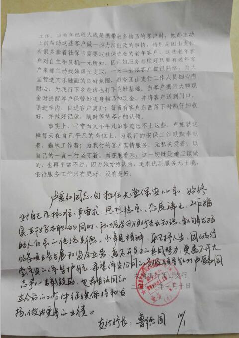 事實上,平常而又不平凡的事跡遠不止這些,盧姐就這樣每天在自己平凡的崗位上,為我行的安保工作默默奉獻著,勤懇工作著;為我行的客戶真情服務,無私關(guān)愛著;以自己的一言一行堅守著。而在我看來,這一切既是她應該做的,也再平常不過,因為她始終認為,追求優(yōu)質(zhì)服務無止境銀行服務工作只有更好,沒有最好